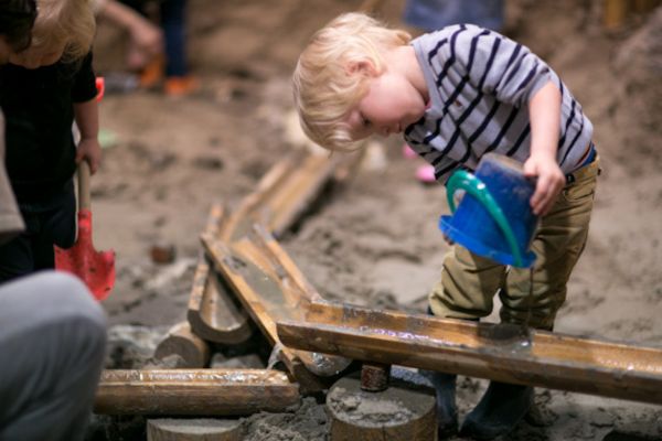 Sand and water play areas, enhanced with tools like portable pumps, mud...