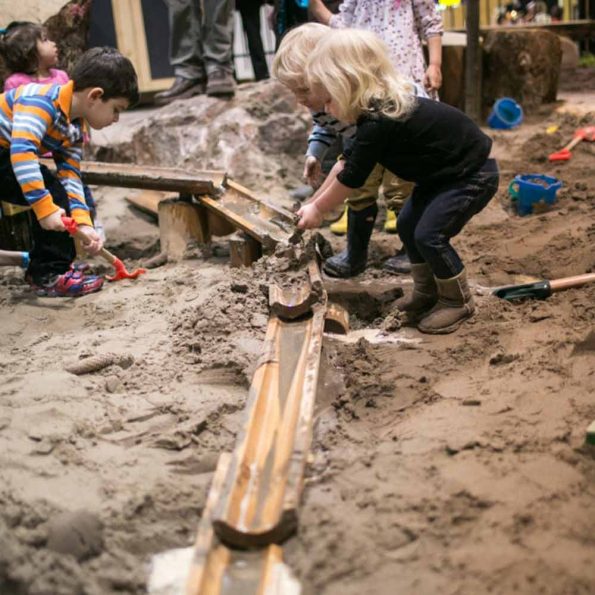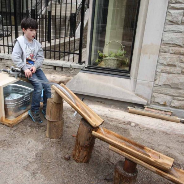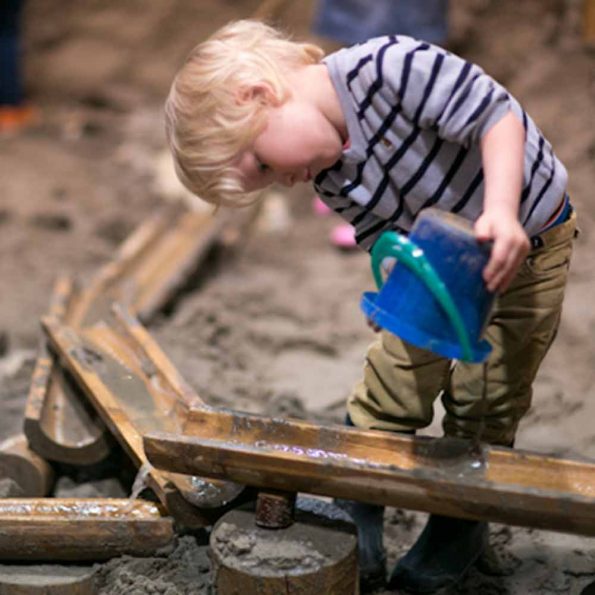 Sand and water play areas, enhanced with tools like portable pumps, mud...